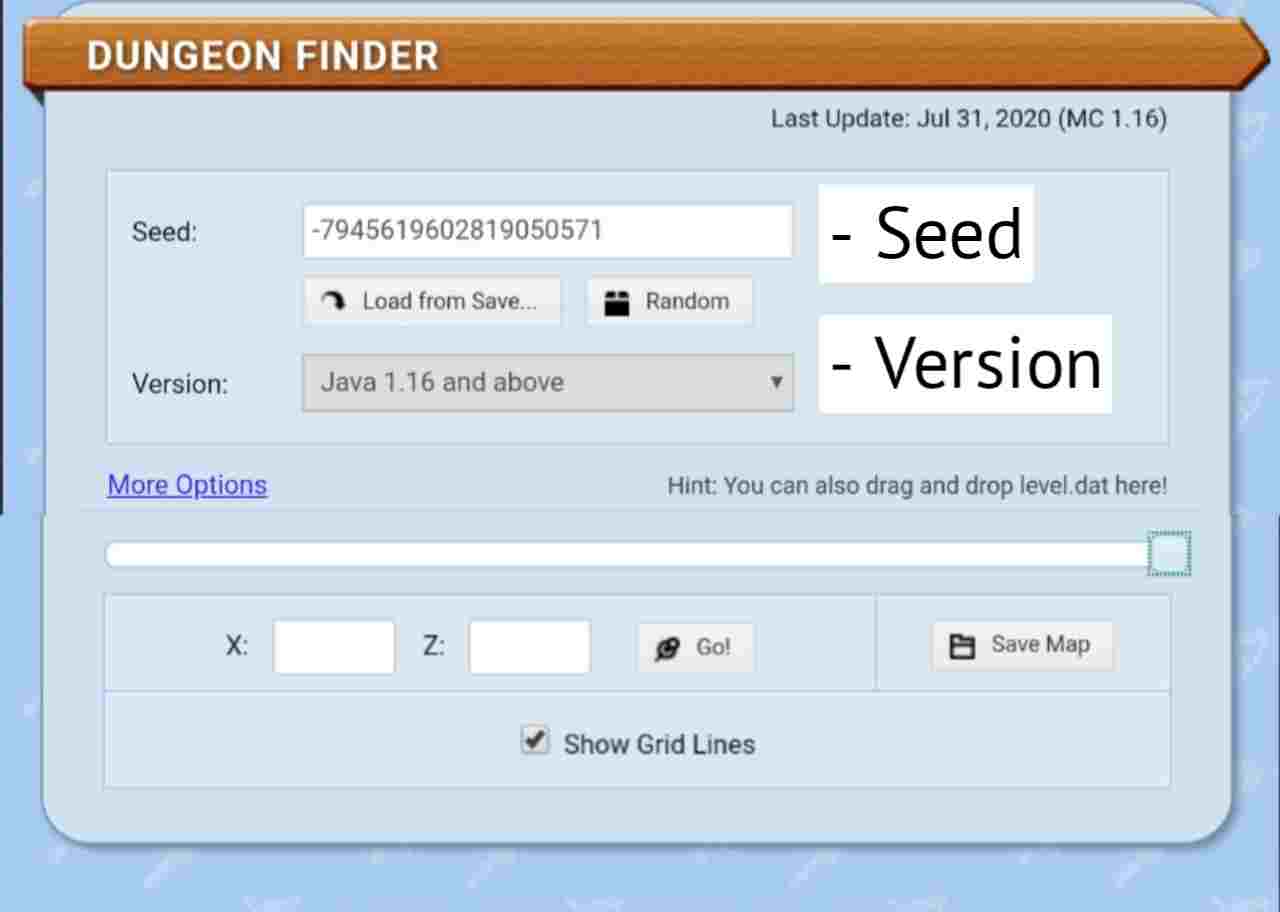 - Go to https://www.chunkbase.com/apps/dungeon-finder, don’t forget to write down your Minecraft world seed.