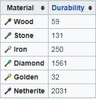 As you can see here that the iron has durability 250 which is far better from wood, stone, or gold and that is why I recommend using this.